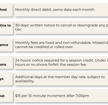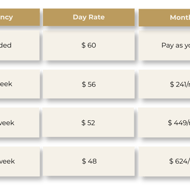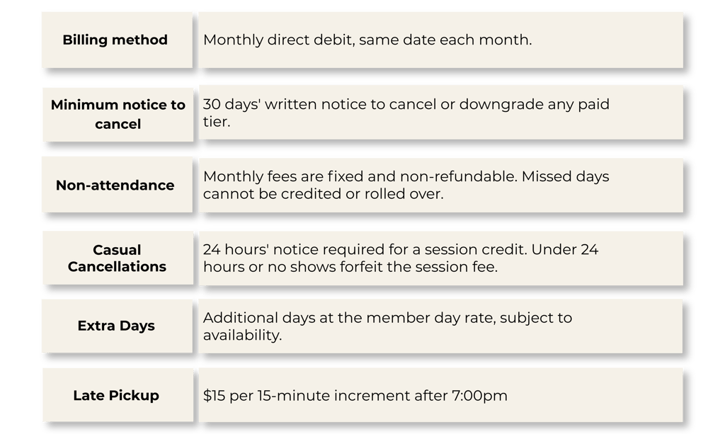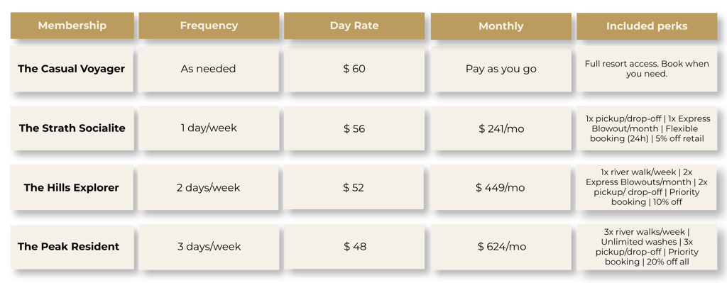 The paid tiers below are optional upgrades — designed to reward loyal residents with reduced daily rates, complimentary services, and genuine perks. All paid tiers are billed monthly via direct debit. Monthly prices are calculated on a 52-week annual spread, which keeps your payments consistent throughout the year — even across school holidays and long weekends.