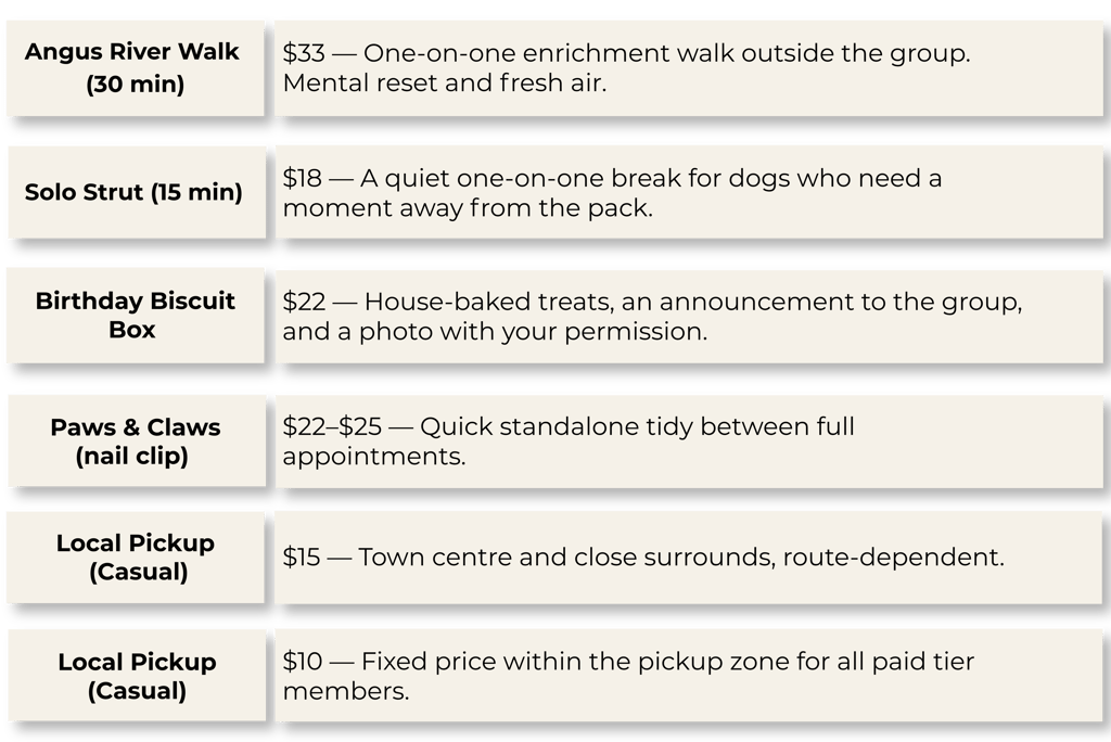 Exclusive Events — Paws & Prosecco evenings, the annual Hills Christmas photo shoot, Howl-o-ween, and seasonal pop-ups. Priority booking and complimentary entry.