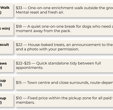 Every new dog begins here. The Paws-port is a 30-day introduction that lets us understand your dog's social style, leash behaviour, and preferred corner of the resort.